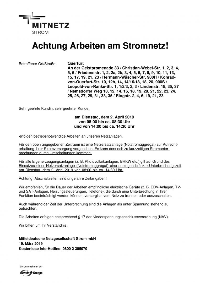 aufgrund betriebsnotwendiger Arbeiten am Versorgungsnetz seitens MITNETZ kann es am 02.04.2019 in der Zeit von 08:00 - 08:30 und 14:00 - 14:30 zu Unterbrechungen der Stromversorgung kommen.