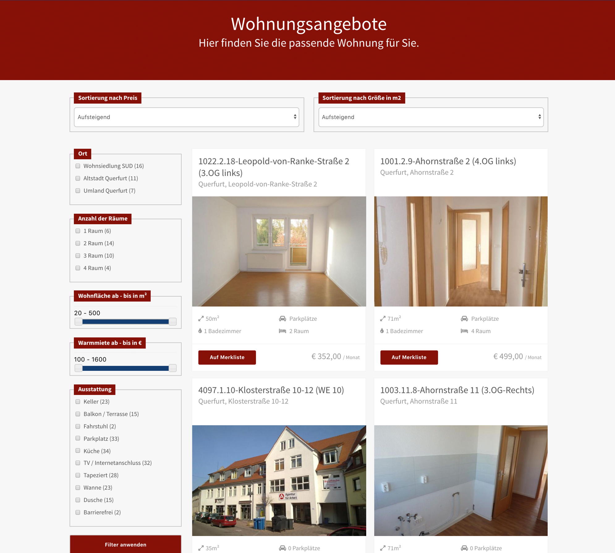 Filtern Sie aus verschiedensten Eigenschaften Ihr neues Zuhause in Querfurt heraus. Sie können dabei wählen, ob Ihre Wohnung einen Balkon, einen Parkplatz oder Dusche und WC beinhalten soll. Auch barrierefreie Wohnungen sind in Querfurt im Angebot.